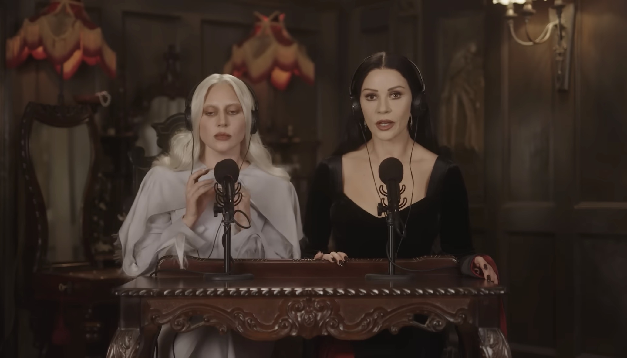 Lady Gaga and the cast of Netflix’s “Wednesday” season two fully embody the Halloween spirit as two new promotional videos were released in honor of the holiday. One is the long-awaited ASMR video with Gaga and co-star Catherine Zeta-Jones, who plays Morticia Adams. The other video features Gaga doing “The Dead Dance” with Emma Myers (Enid Sinclair) and Evie Templeton (Agnes DeMille). In September, Myers and Templeton joined Gaga on stage at a MAYHEM Ball show at London’s O2 Arena during “Lov